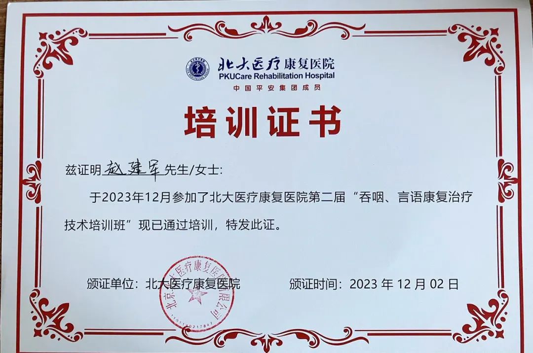 2023年12月01日-02日,合肥佰惠長榮醫院神經康復科胡永軍和趙建軍醫生以及康復治療師李童、朱冉冉參加了由北大醫療康復醫院舉辦的第二屆“吞咽、言語康復治療技術培訓班”,期間他們積極參與學習,并成功獲得培訓證書。這一成果的取得不僅展示了我院醫療團隊的專業能力和學習態度,也將為患者提供更加專業、全面的康復服務。