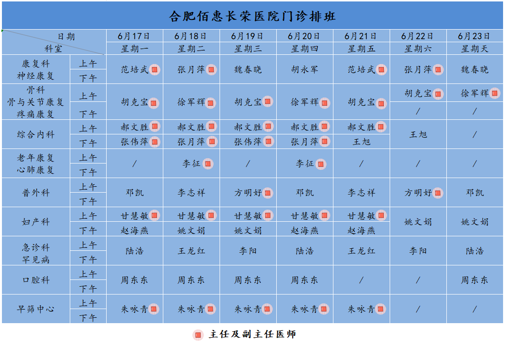 為方便廣大市民了解合肥佰惠長榮醫院門診醫師出診安排,現發布下周(6月17日-6月23日)門診醫師排班表,請大家合理安排就診時間。如遇停診、換診等特殊情況有所調整,以當日出診安排為準,造成不便敬請諒解!