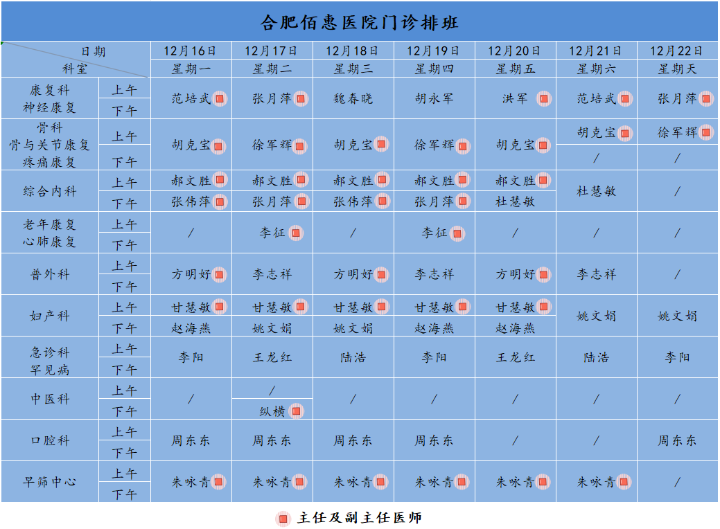 為方便廣大市民了解合肥佰惠醫院門診醫師出診安排,現發布下周(12月16日-12月22日)門診醫師排班表,請大家合理安排就診時間。如遇停診、換診等特殊情況有所調整,以當日出診安排為準,造成不便敬請諒解!