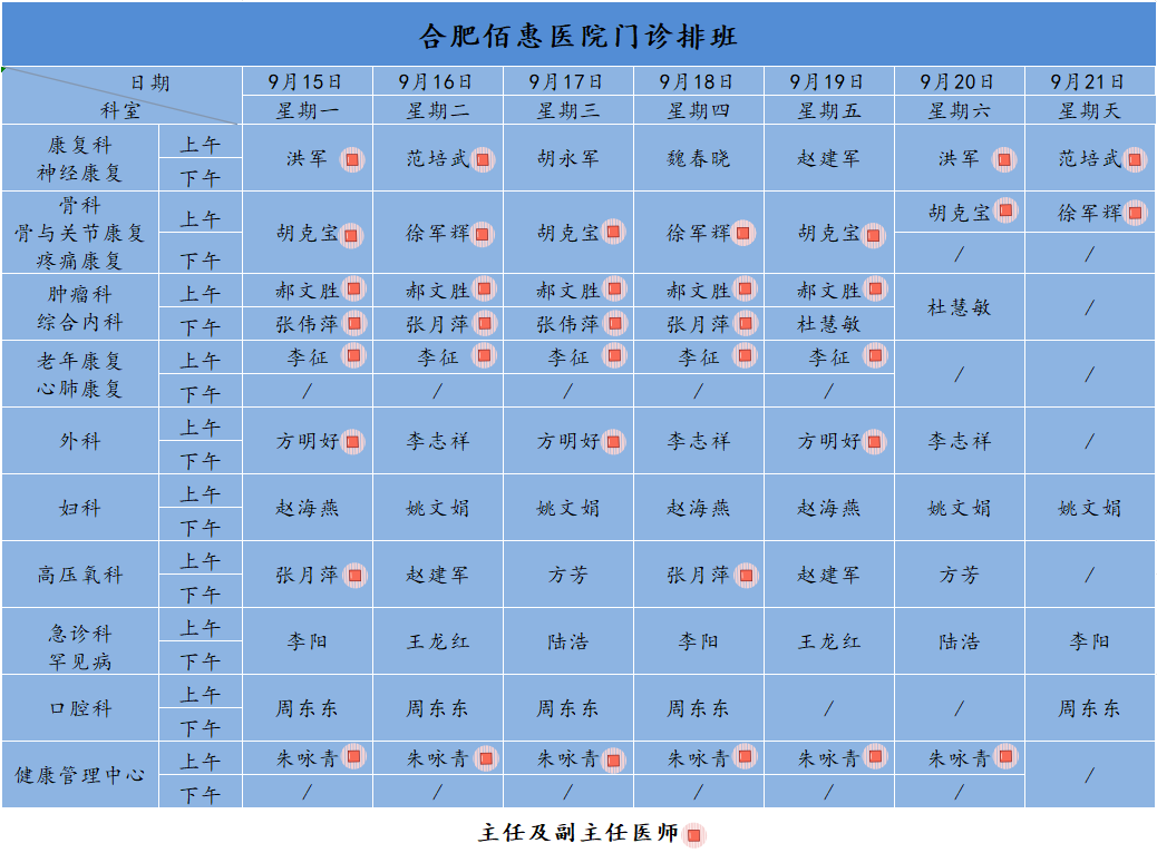 為方便廣大市民了解合肥佰惠醫院門診醫師出診安排,現發布本周(9月15日-9月21日)門診醫師排班表,請大家合理安排就診時間。如遇停診、換診等特殊情況有所調整,以當日出診安排為準,造成不便敬請諒解!