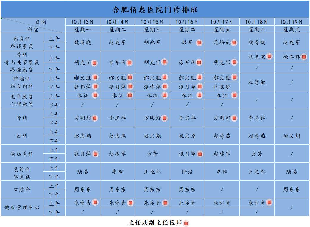 為方便廣大市民了解合肥佰惠醫院門診醫師出診安排,現發布本周(10月13日-10月19日)門診醫師排班表,請大家合理安排就診時間。如遇停診、換診等特殊情況有所調整,以當日出診安排為準,造成不便敬請諒解!