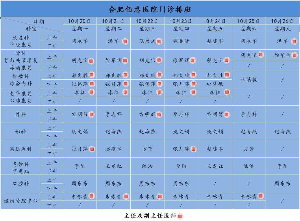 為方便廣大市民了解合肥佰惠醫院門診醫師出診安排,現發布本周(10月20日-10月26日)門診醫師排班表,請大家合理安排就診時間。如遇停診、換診等特殊情況有所調整,以當日出診安排為準,造成不便敬請諒解!
