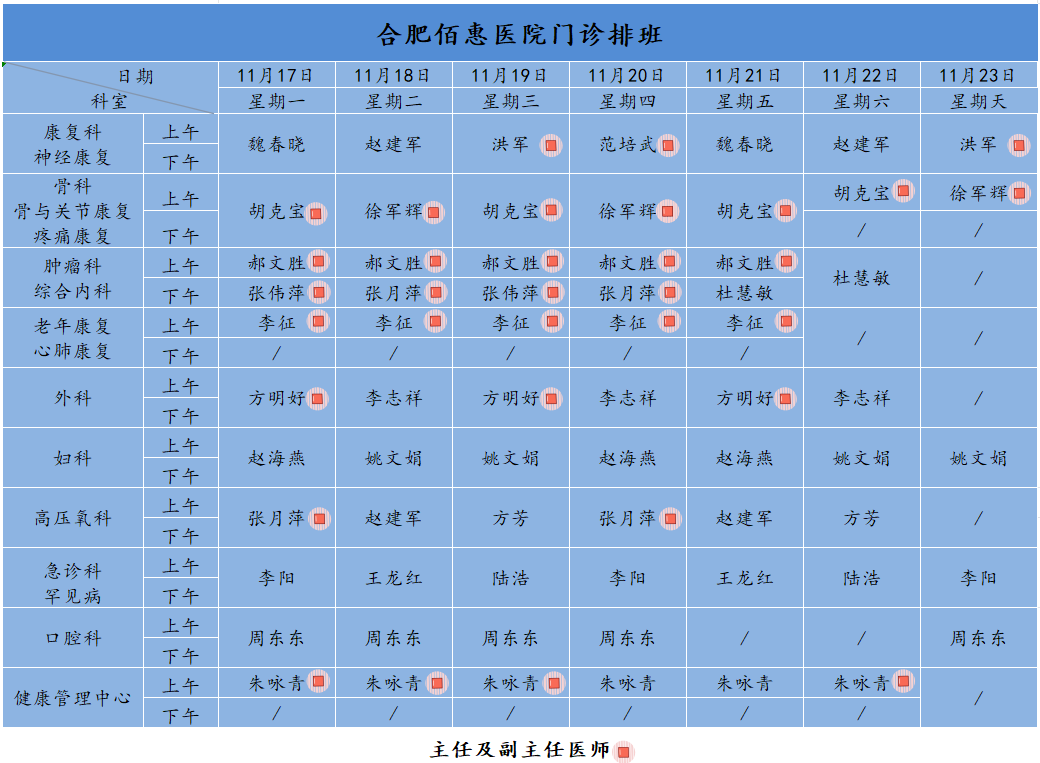 為方便廣大市民了解合肥佰惠醫院門診醫師出診安排,現發布本周(11月17日-11月23日)門診醫師排班表,請大家合理安排就診時間。如遇停診、換診等特殊情況有所調整,以當日出診安排為準,造成不便敬請諒解!