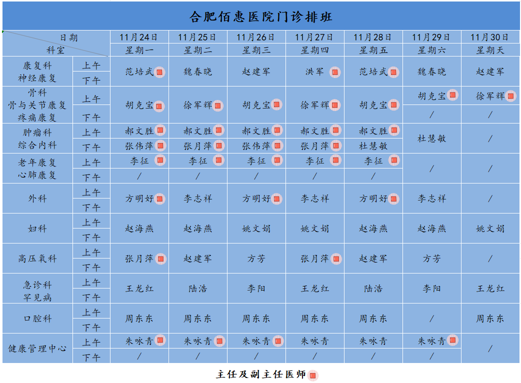 為方便廣大市民了解合肥佰惠醫(yī)院門(mén)診醫(yī)師出診安排,現(xiàn)發(fā)布本周(11月24日-11月30日)門(mén)診醫(yī)師排班表,請(qǐng)大家合理安排就診時(shí)間。如遇停診、換診等特殊情況有所調(diào)整,以當(dāng)日出診安排為準(zhǔn),造成不便敬請(qǐng)諒解!